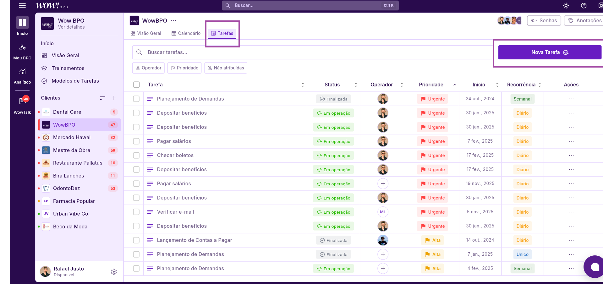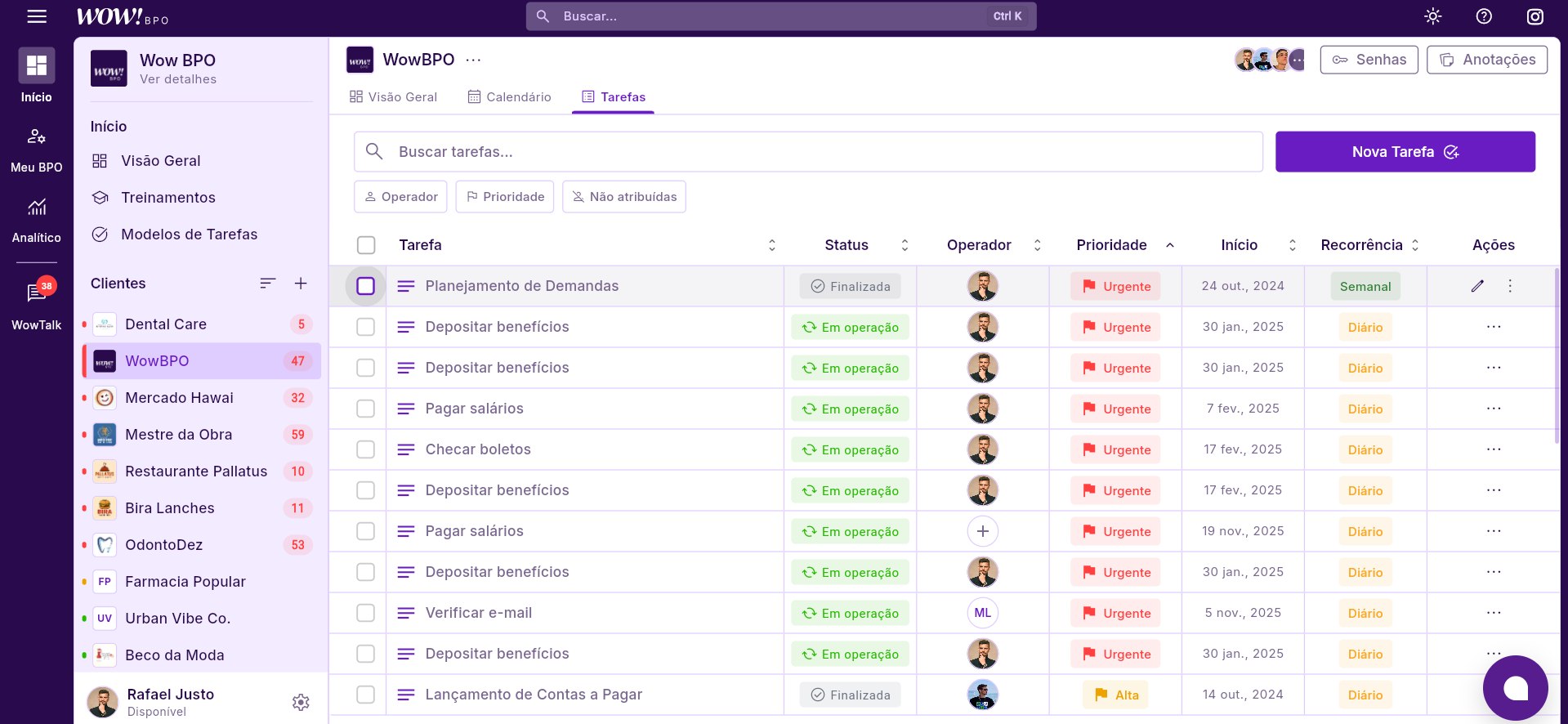 Você pode clicar em cima dos Status, Operadores, Prioridade e Recorrência para alterar tudo dentro desta mesma tela.