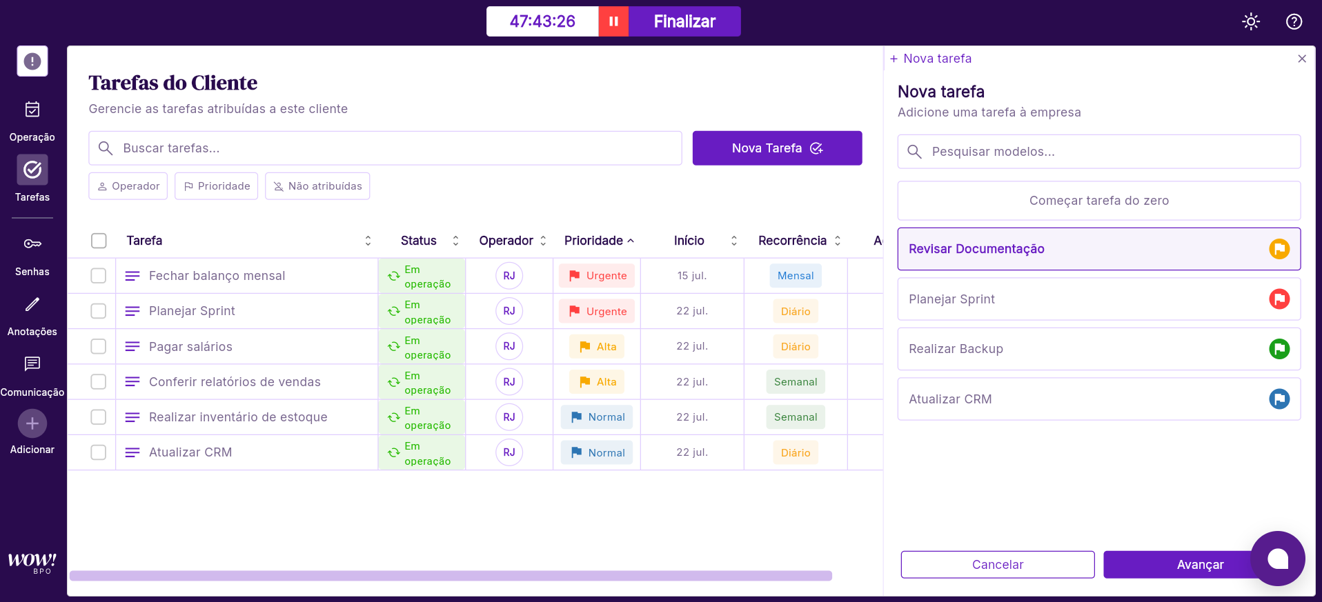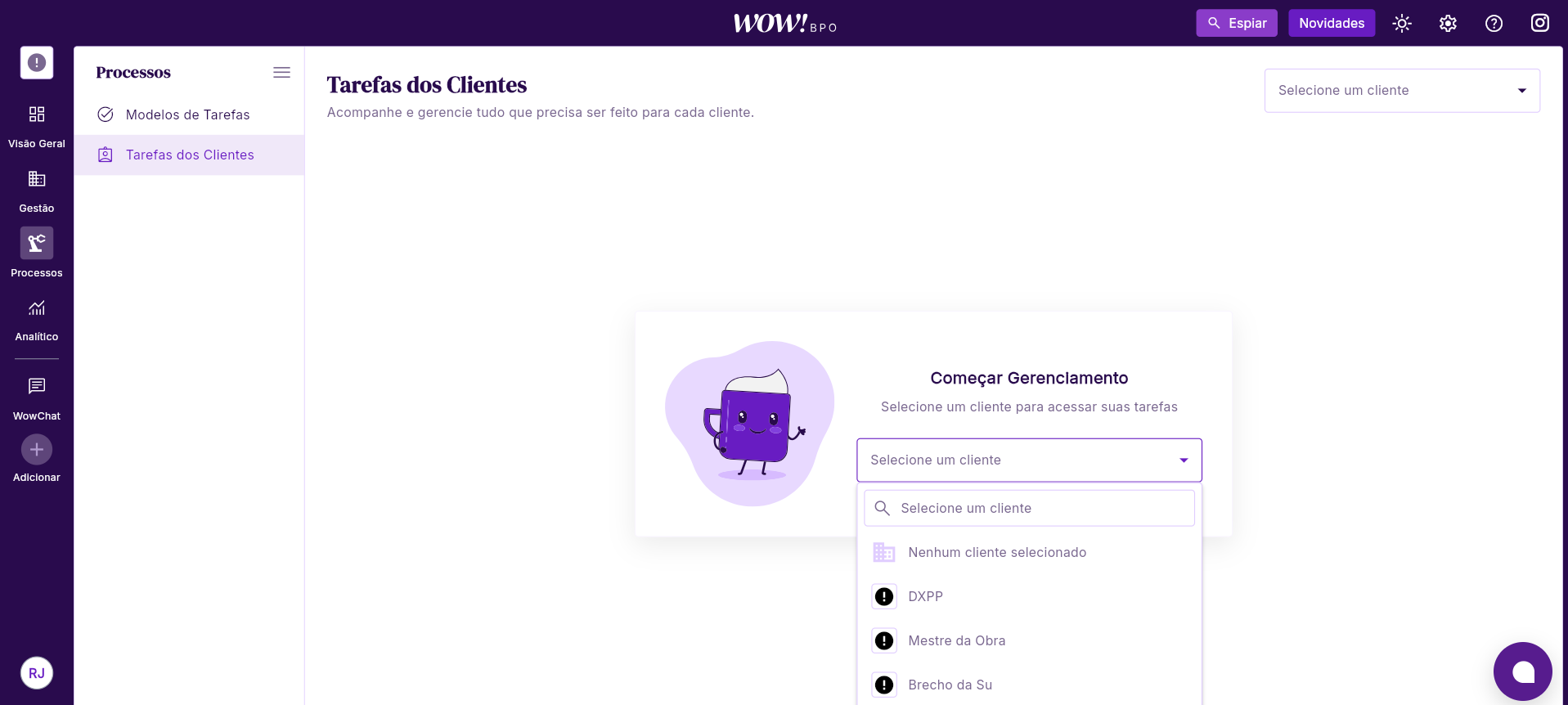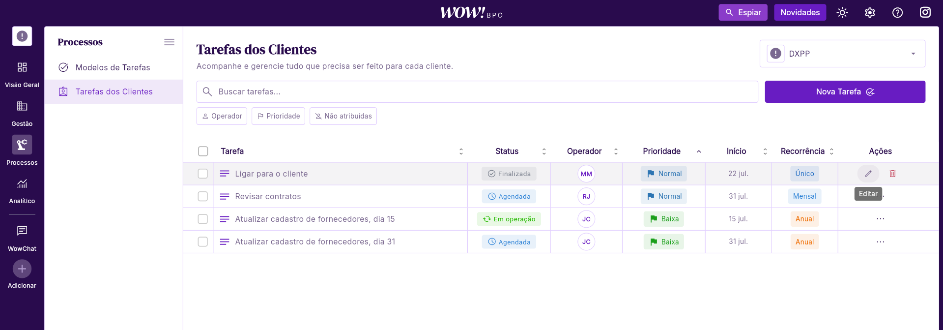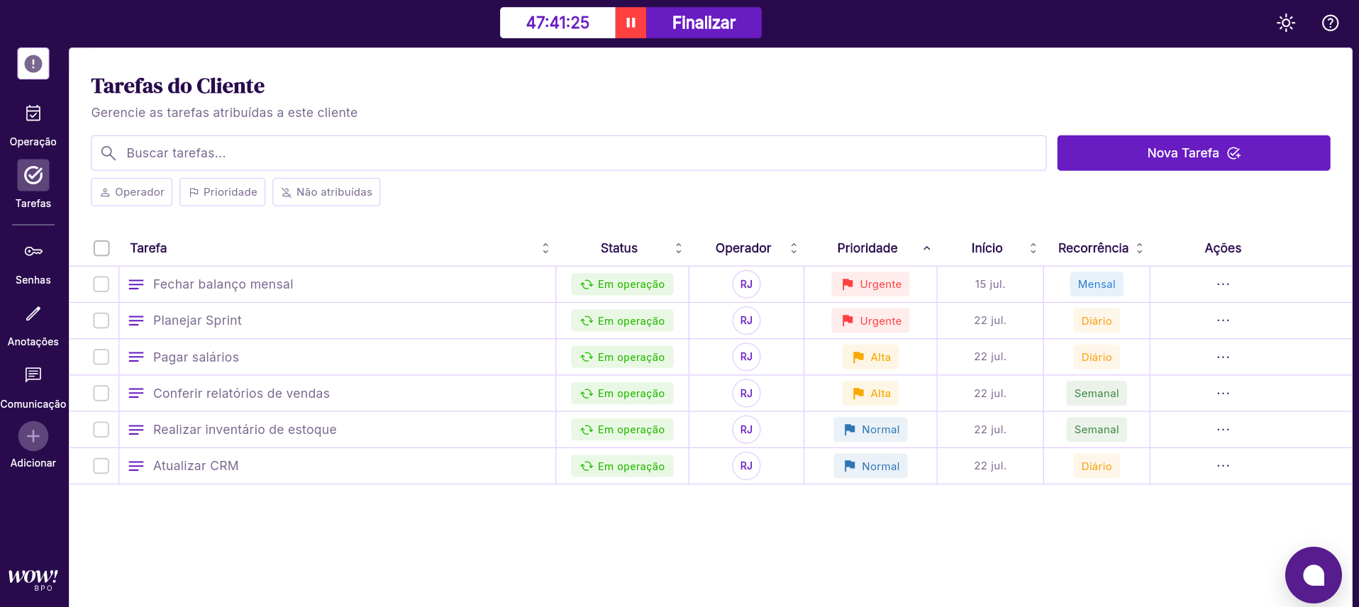 Você pode gerenciar e criar tarefas para seus clientes diretamente pela aba Tarefas dentro da plataforma WowBPO.