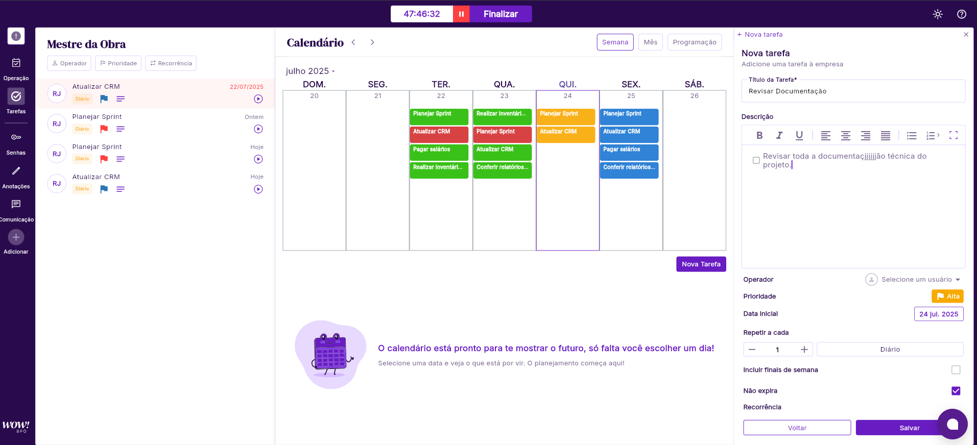 Ao cadastrar as tarefas, você cria uma agenda clara e estruturada de tudo o que precisa ser feito. Isso permite que todos os membros da equipe saibam exatamente o que esperar e quando as tarefas precisam ser realizadas. Cada tarefa terá sua própria data, descrição e responsável, garantindo que nada seja esquecido.