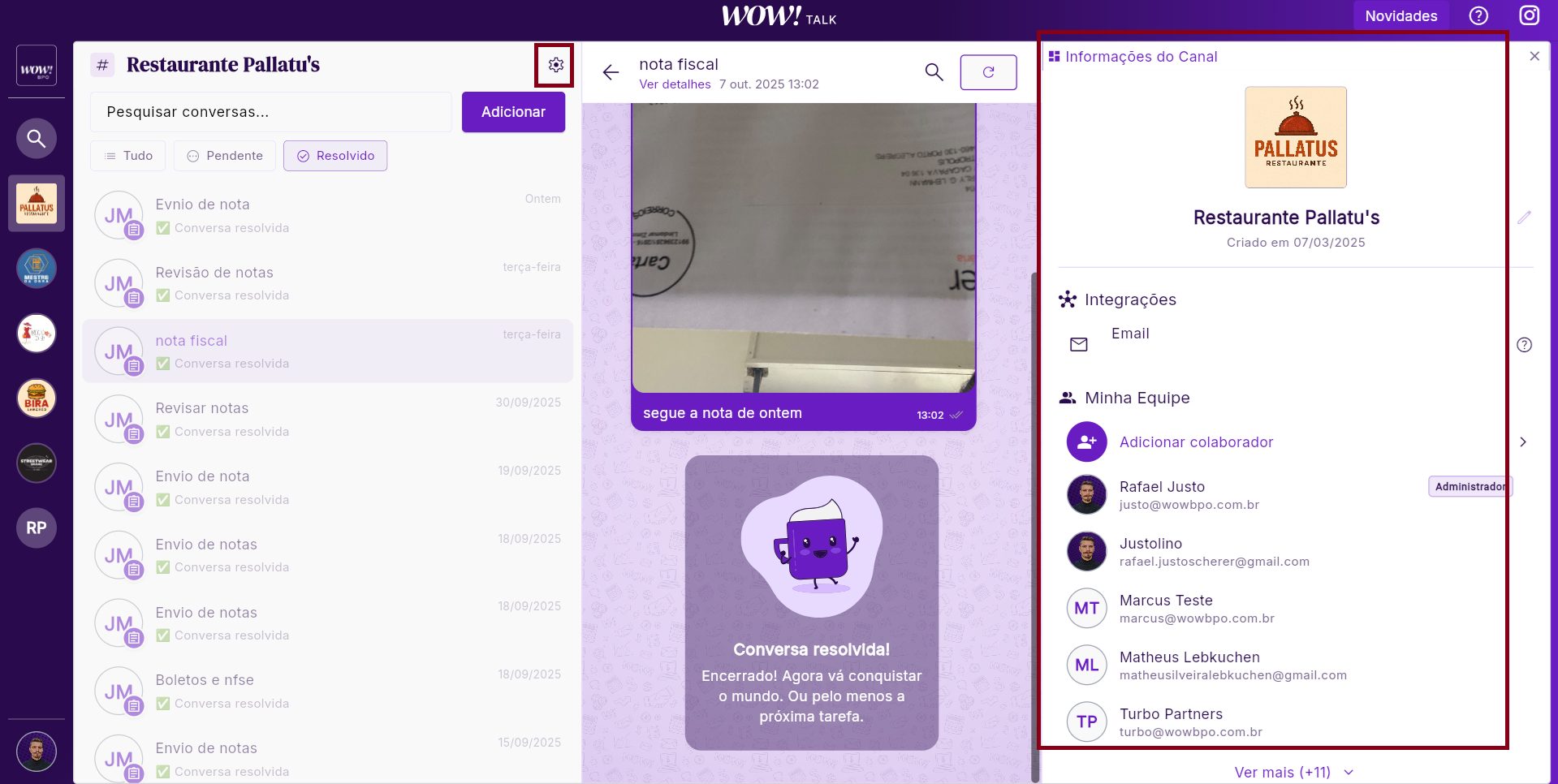 Inicialmente, você poderá visualizar as informações da sua empresa dentro do WowTalk: