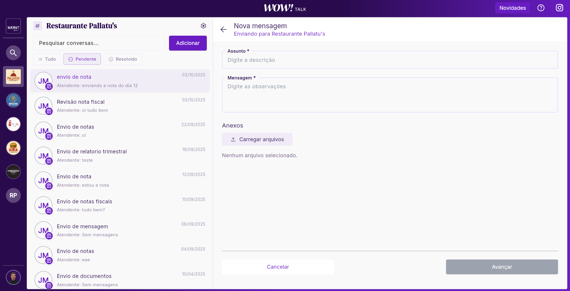 Ao clicar, será necessário inserir o Assunto da conversa e a mensagem inicial, que será exibida de forma fixa no chat. Adicionalmente, esta funcionalidade permite anexar arquivos conforme necessário.