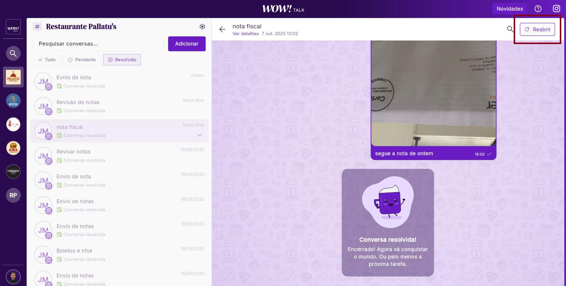 Ao selecionar um chat previamente resolvido, a opção de reabertura da conversa estará disponível para uso, caso seja necessário retomar a comunicação.