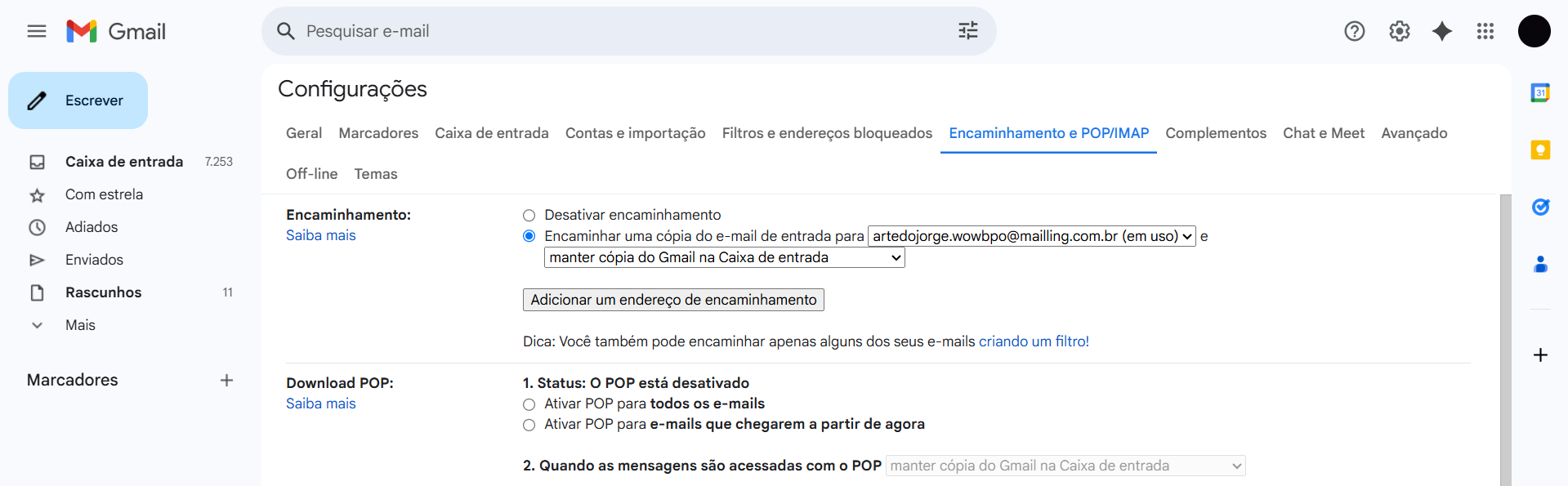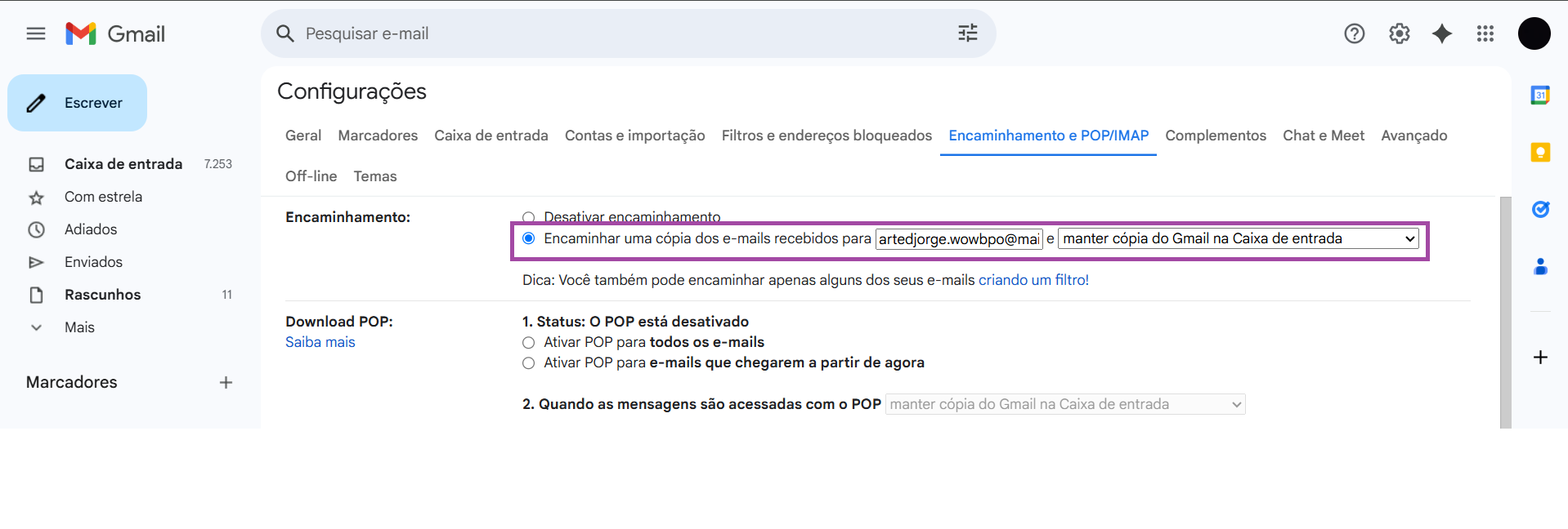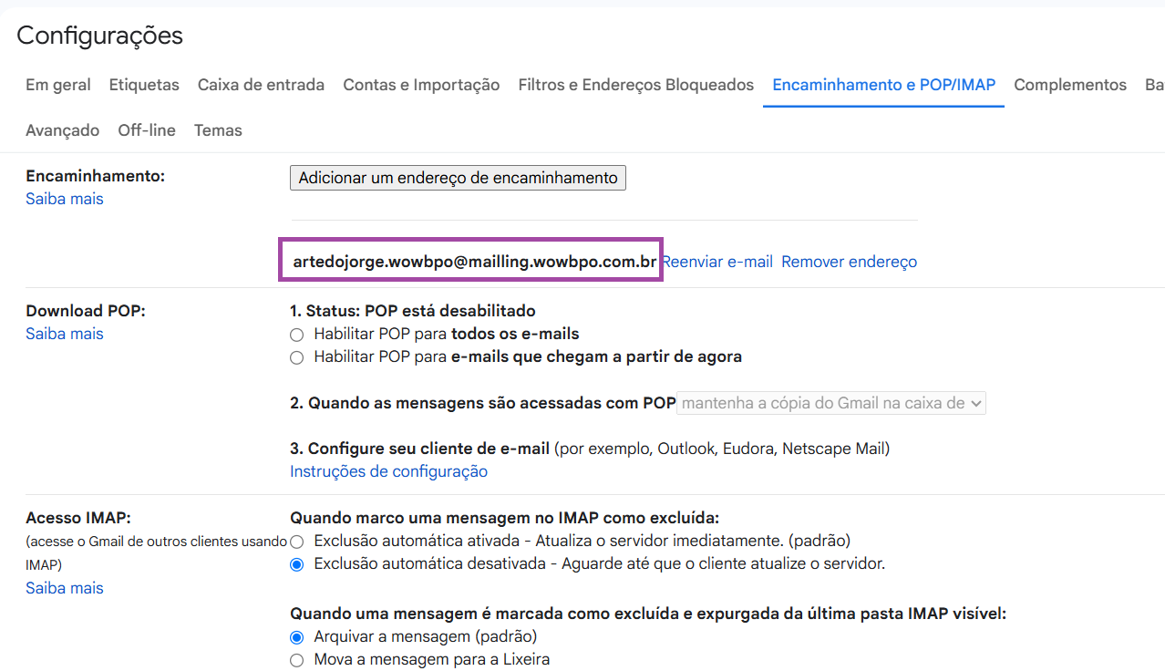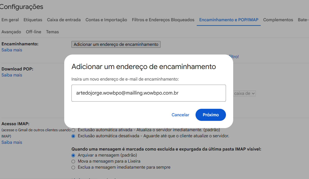 Após isso em Encaminhamento, preencha o campo com o e-mail que você deseja encaminhar ( nesse caso o da Wow!) e mantenha uma cópia do Gmail na caixa de entrada.