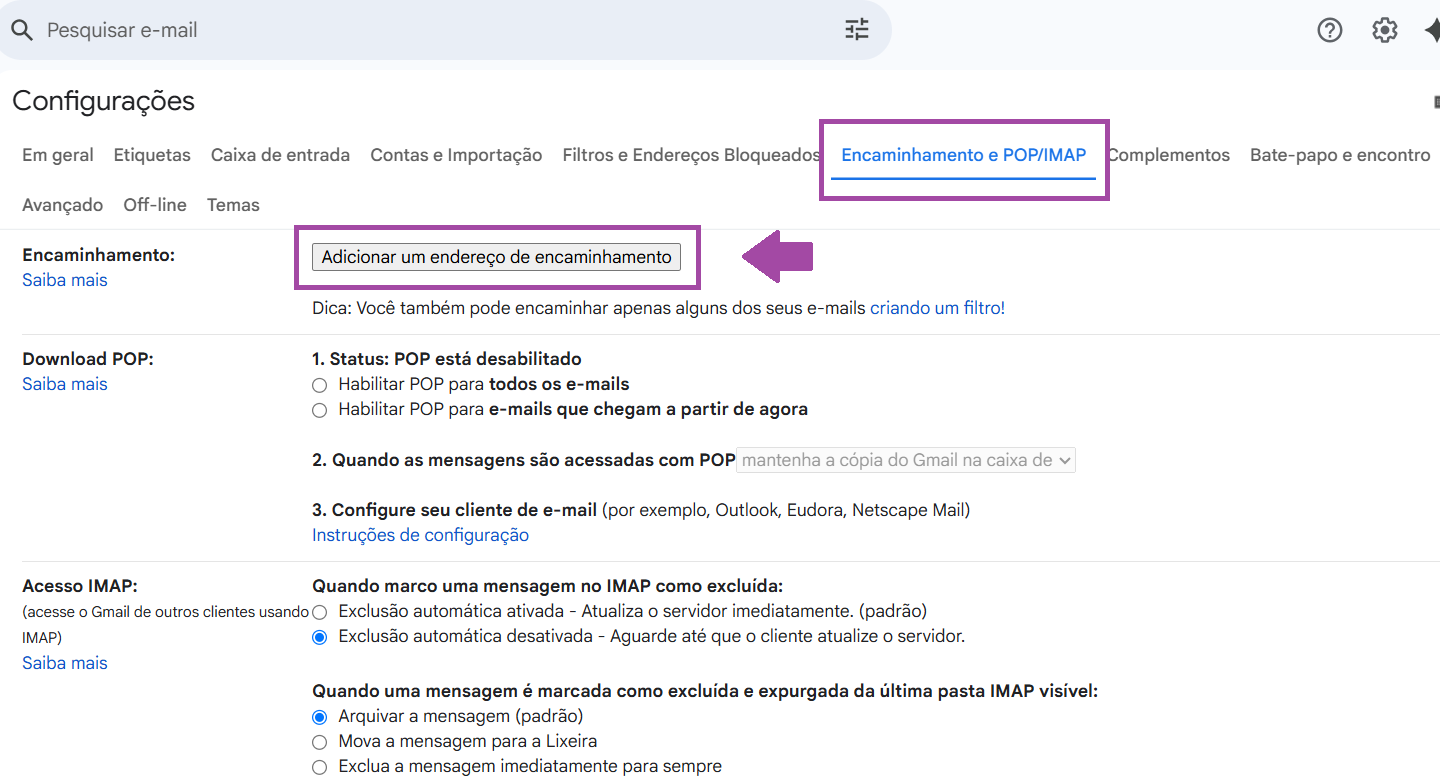 Em seguida acesse a opção Encaminhamento e POP/IMAP e clique na opção de adicionar um endereço de compartilhamento.