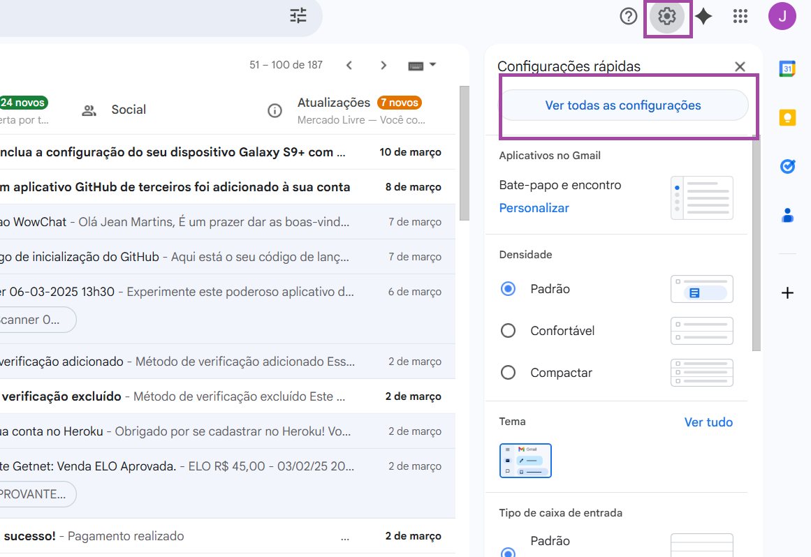 Para configurar, acesse as configurações do seu Gmail: