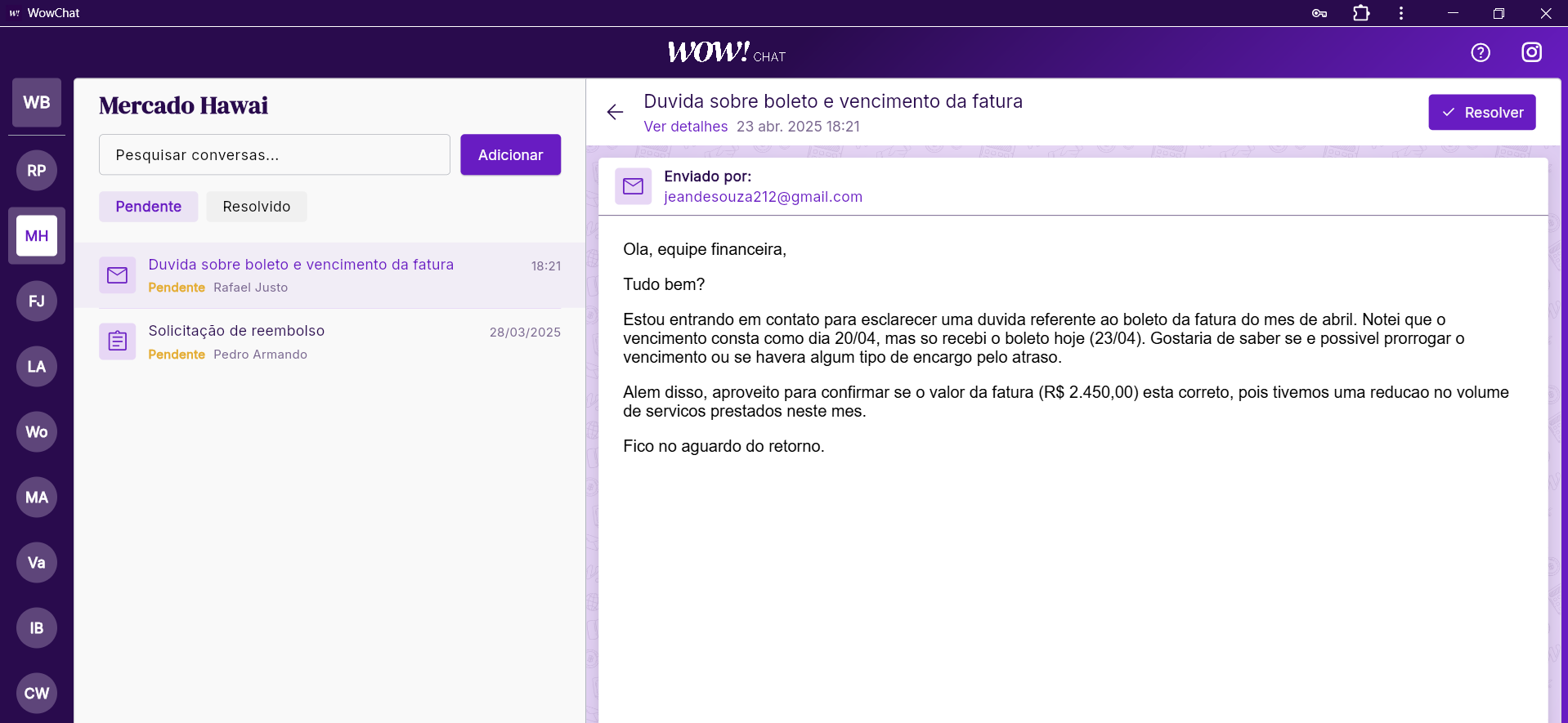 Imagine receber os e-mails de seus clientes diretamente no WowChat.