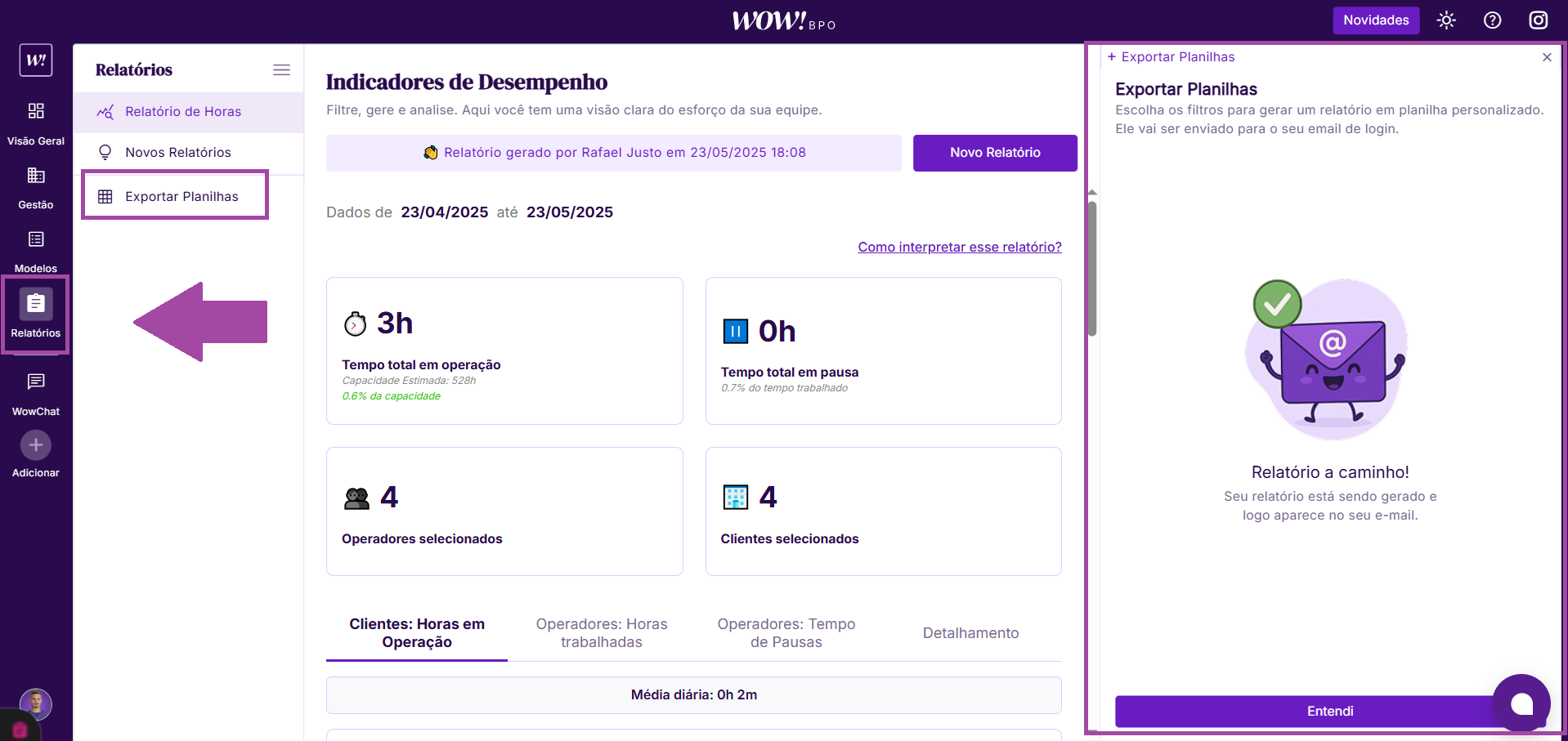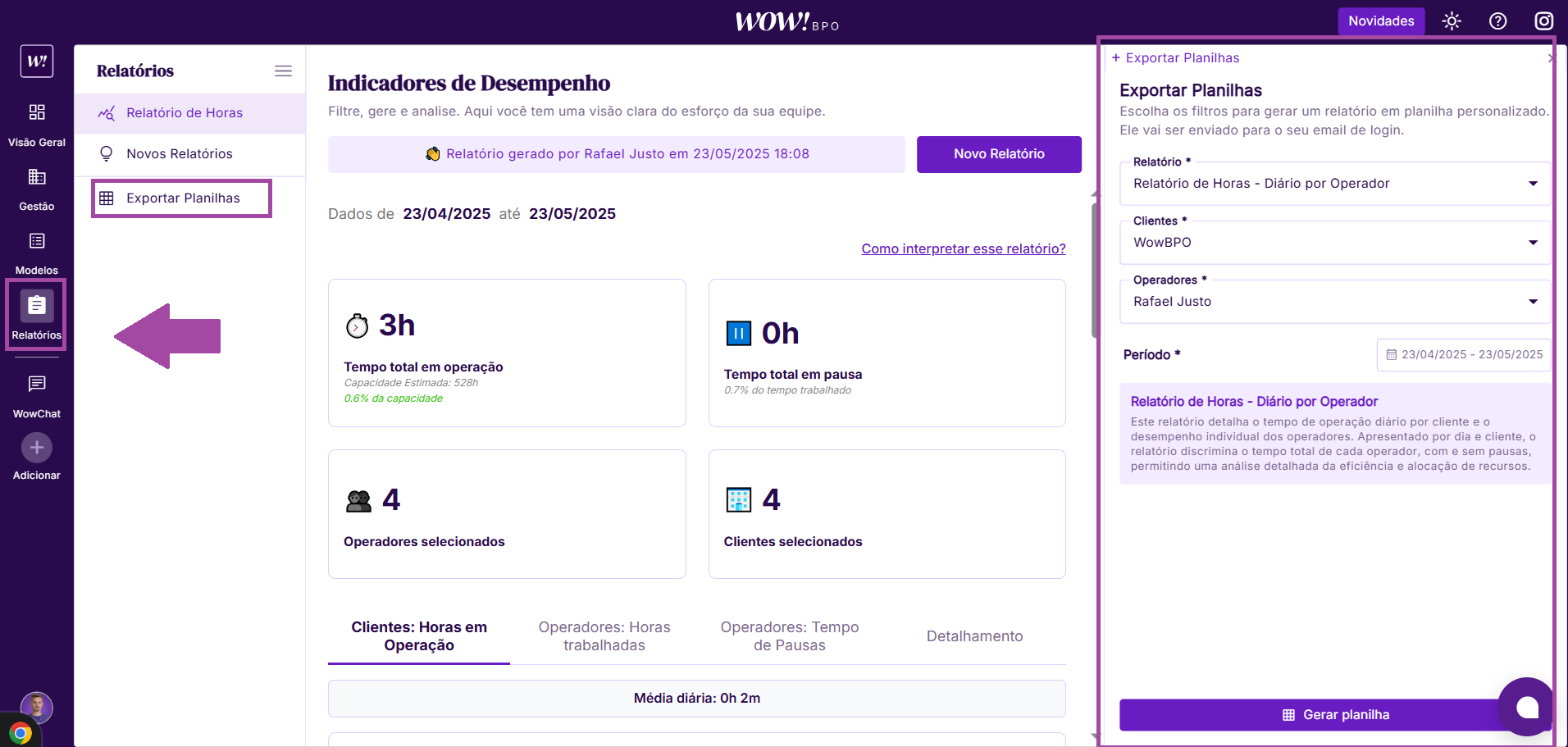 Em seguida, será aberto um menu lateral à direita. Nele, você deverá selecionar o relatório desejado, o cliente, os operadores e o período correspondente. Após preencher todas as informações, clique em "Gerar Planilha" para concluir a exportação.