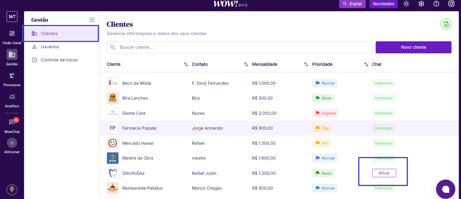 Para ativar a sua WowTalk, acesse a aba Gestão e clique em Clientes.