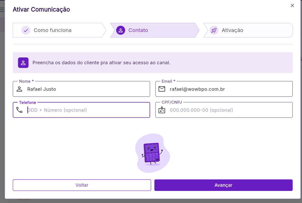 Depois disso, basta seguir o passo a passo exibido na sua tela, adicionando o contato do cliente para ativar o acesso ao canal.