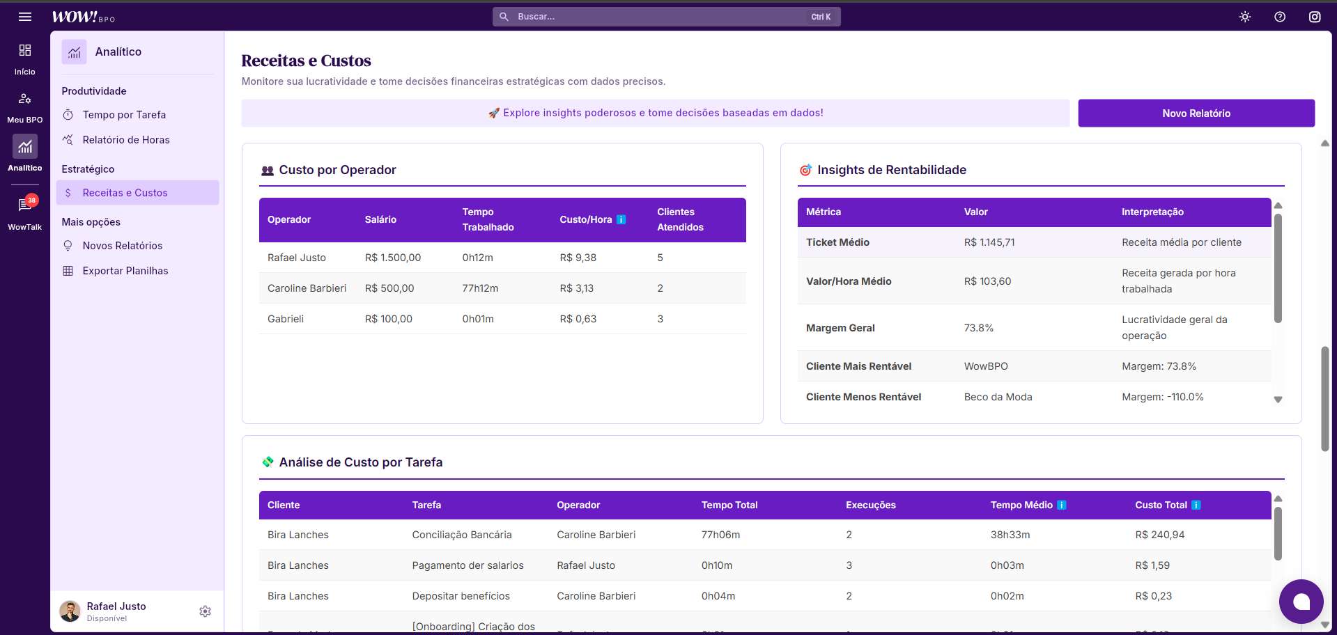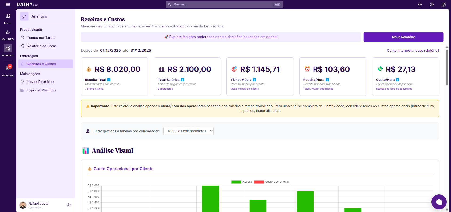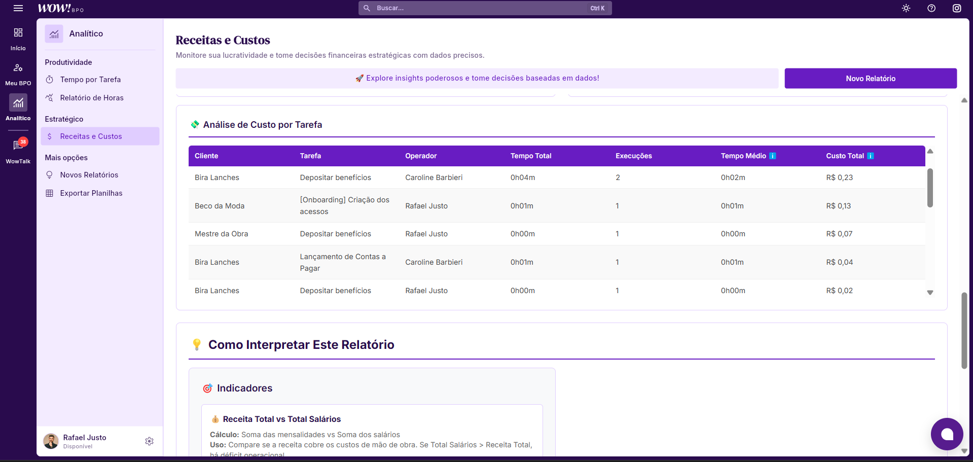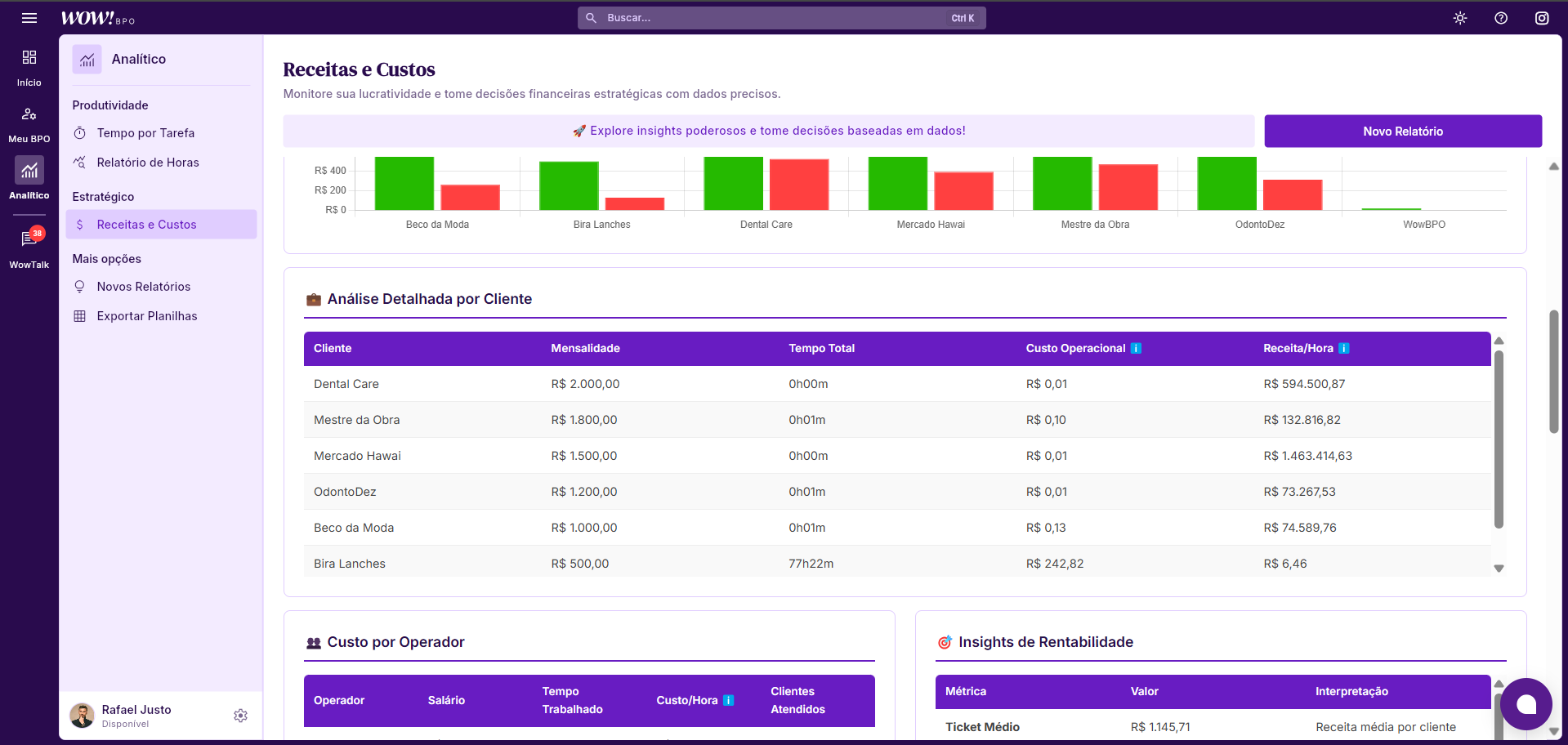 Logo a baixo, você visualiza o Custo por Operador e Insights de Rentabilidade