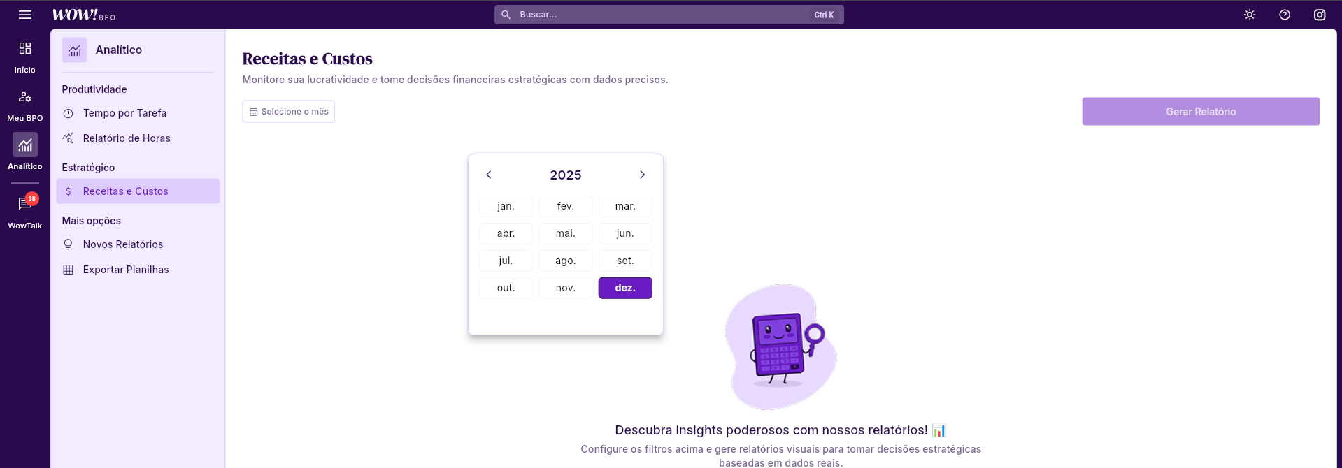 Para acessar os relatórios de Receitas e Custos na WowBPO, siga os passos abaixo:
