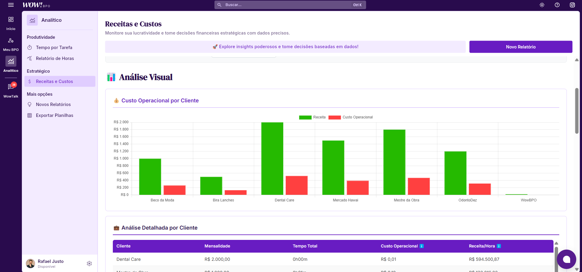 Além dessas informações, a funcionalidade também apresenta uma análise visual, destacando o Custo Operacional por cliente.